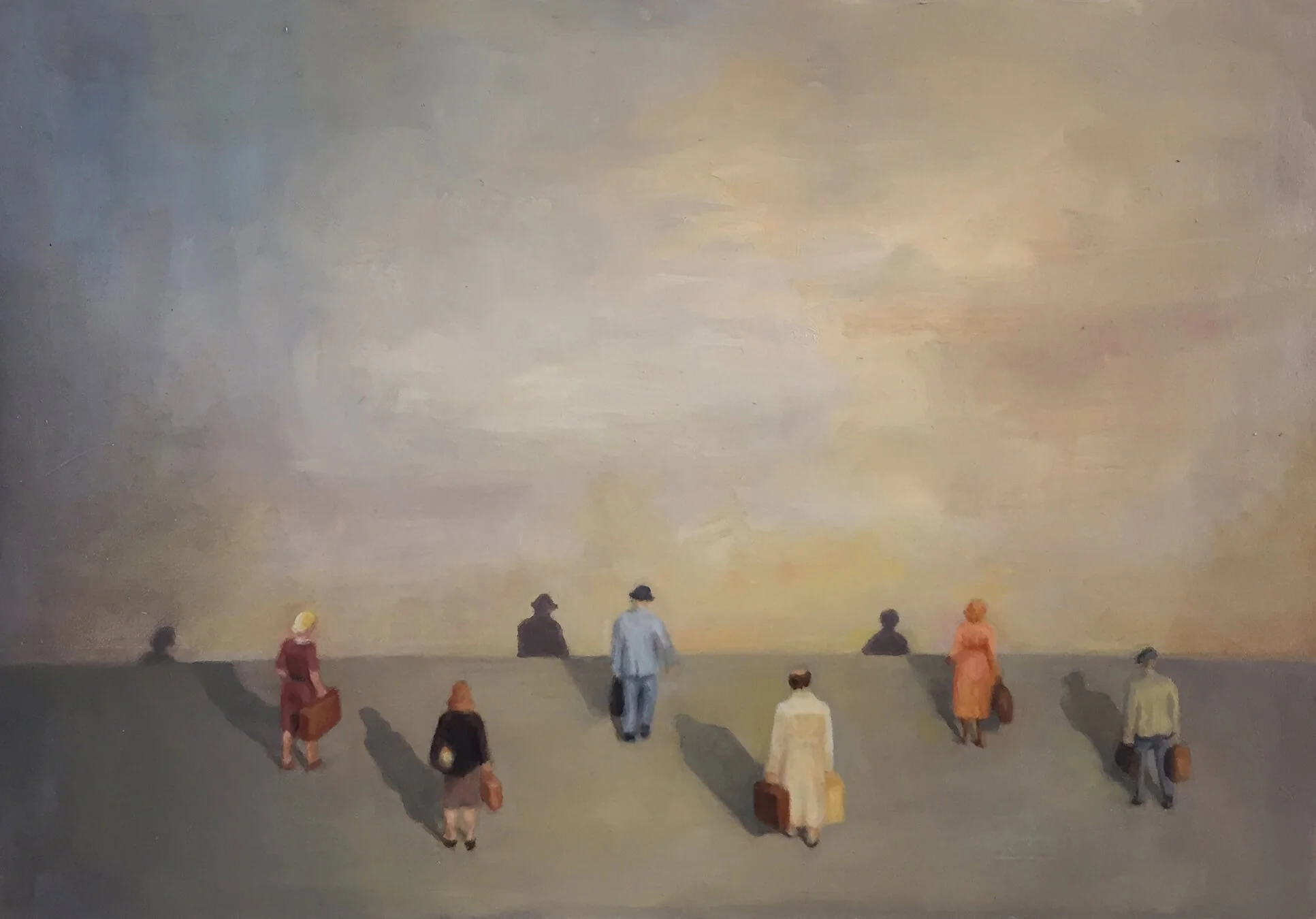In her painting Travelers, we see a group of figures with their backs turned to us, clasping their luggage and walking towards the horizon. Each traveler is self-contained and does not interact with the others. I wonder where they are going. Several shadows are not connected to any of the figures and appear to be slipping over the edge. The shadows appear to have their own agency. They don't always feel connected with real time and space.