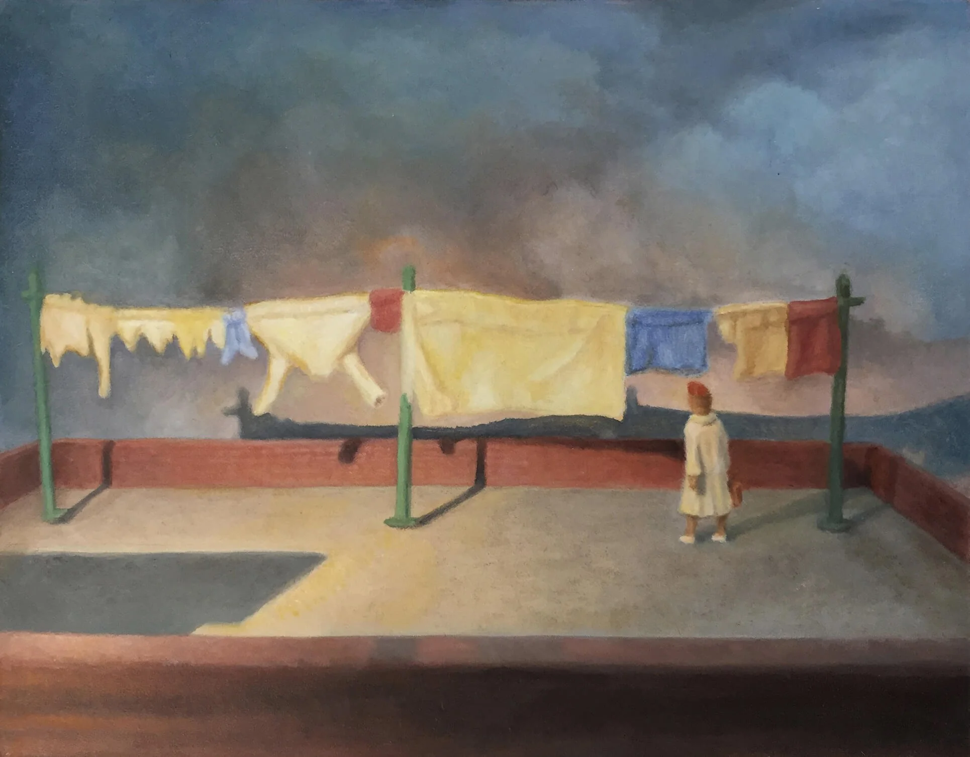 The smooth surface of the oil paintings creates a cinematic or dream-like feeling, but the content is fairly ordinary, with tiny people waiting at train stations, tiny women next to clotheslines on rooftops, figures walking under bridges in the snow, walking on pathways between blocky apartment buildings, walking on ice floes, or riding bikes. The skies in her paintings have storm clouds or are painted in unearthly yellow colors that help create an uncanny feeling. Her imagery of rooftops, bridges, passageways, and train stations is liminal space. Liminal spaces are unsettling, haunted spaces, passageways, doors to the unknown, spaces in transition that are uncomfortable because, as human beings, we naturally fear the unknown. Metaphysical painter Giorgio de Chirico addressed these types of spaces with his paintings of mannikins, train stations, shadows, and empty urban spaces. The Surrealists followed with their absurdist and dream-based work created after World War I, and the end of the civilized world they knew. Pearlin's paintings are contemporary and echo the concerns and imagery of these painters as she creates her own stories that are inscrutable, where something menacing is often hidden under the veneer of normality.