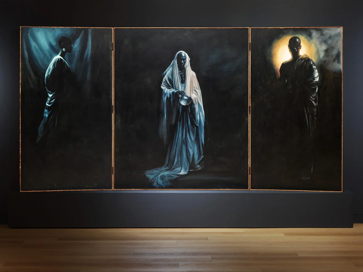 The exhibit not only elevates Blackness, but it alchemizes both self-imposed and systematic boundaries, thereby turning them into cosmic matter. It insists on the cosmic gaze being what leads the journey of becoming the Self and that Blackness has always been an active horizon with actualized potential. Its beingness is not something to explain, defend, or deny - it is meant to be encountered and witnessed as its radiance cannot be quantified or repudiated. The greatest gift from this exhibit is that it highlights that radiance is not only about that which is visible. It is an amalgamation of ancestral, mythical, and cosmological forces that bind a life together. Darkness/Blackness is not a site of escapism or subjugation, but a place Beingness is fully recognized and actualized.