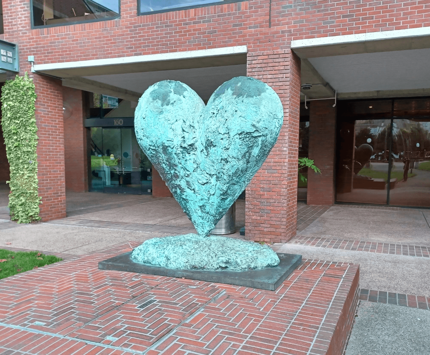 The first public art work in San Francisco I ever came across with any awareness of it as such (aside from the Vaillancourt fountain at skater mecca EMB plaza on my first visit in the late 1980s) was Jim Dine’s “Big Heart on the Rock” (Bronze, 1984) tucked up along the pedestrian path of Pacific Ave between Davis and Front streets among red brick office buildings just down from Jackson Square and only a short stroll away in fact from EMB plaza. That’s the path I always approached it from, after walking along the bay to then turn west heading back into town, passing Dine’s “Heart” making my way up into North Beach invariably bound for City Lights, Vesuvius and Specs.