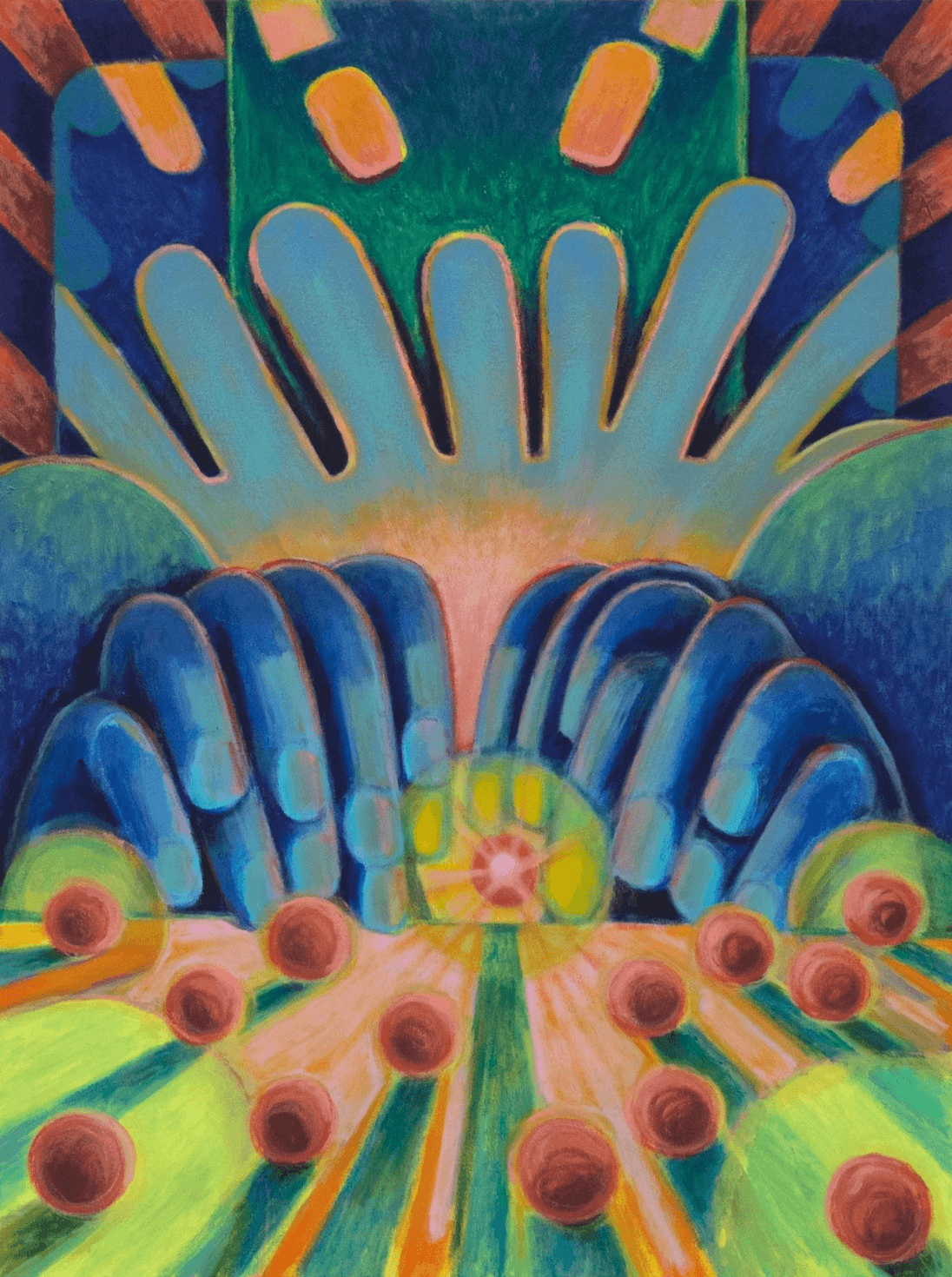 In Dream Sequence 2.0, that relationship to light sharpens. Two large, rounded hands frame a small, glowing form at the center, which reads less like an object and more like a source. The palette is saturated with blues, greens, and sharp orange accents, but it doesn’t sit heavily. The paint softens at the edges, especially where the light seems to move outward, diffusing through the composition. Under the gallery’s late afternoon light, those transitions become more noticeable, pulling the work away from something purely graphic and into something more atmospheric. The repeated circular forms across the lower half build a steady rhythm, echoing the central glow without fully resolving it.