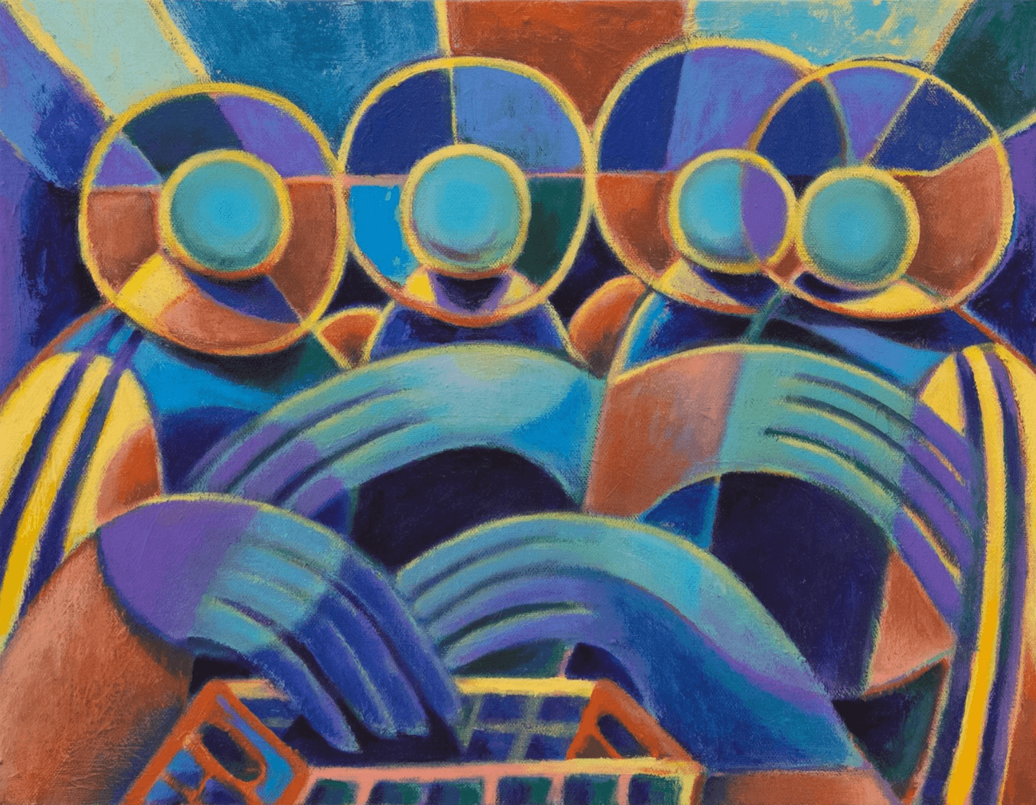 Spiritual Practice pulls things in again, both in scale and feeling. Four figures sit close together, their forms simplified into rounded shapes and repeated circular heads that almost read like halos. They could be friends meeting, or something closer to a quiet form of worship, but the longer you sit with it, it starts to feel more internal than that, like different versions of the self in conversation. Not fixed identities, but shifting states, moving between each other. There’s a sense of looking inward here, of trying to understand something profound. The repetition of forms reinforces that, like thoughts circling, returning, opening slightly each time. It begins to read as a kind of self-examination, where the act of sitting with it gradually widens the space of awareness. The color keeps it alive, moving across the surface so it never settles. It feels less like a scene and more like a ritual or process; something ongoing, shared within the self, and slowly expanding.